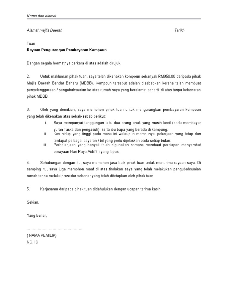 Surat rasmi rayuan pengurangan kompaun surat r. Sayabertarikh 15 julai2016no kompaun 133235 atas kesalahan membiakkan serangga pembawa penyakit 2. Contoh surat rayuan pengurangan bayaran kompaun lhdn.