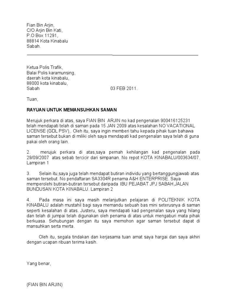 Surat Rayuan Memansuhkan Saman Trafik Pdf